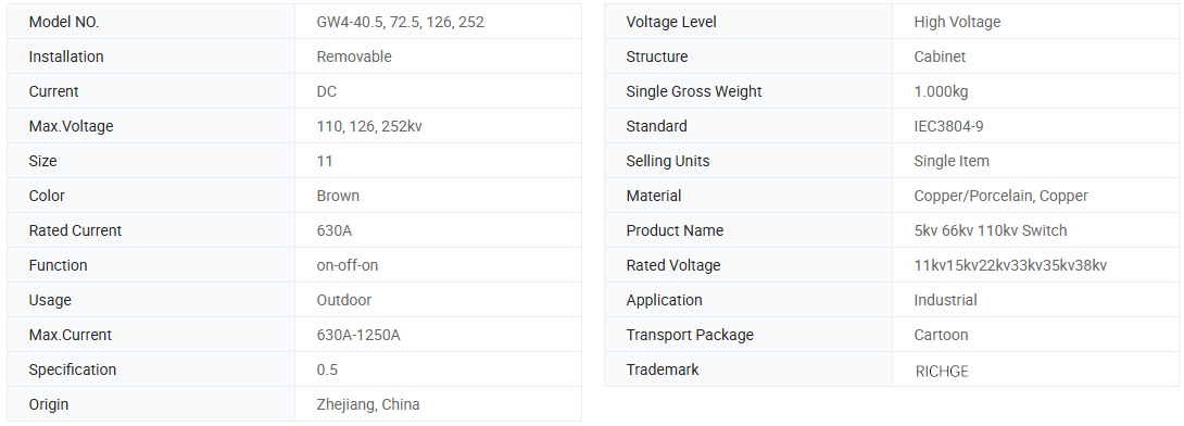 GW4-12 (40.5) అవుట్డోర్ ఎసి హై వోల్టేజ్ డిస్కనెక్ట్ స్విచ్ వోల్టేజ్తో సర్క్యూట్ను తెరవడానికి మరియు మూసివేయడానికి ఉపయోగించబడుతుంది కాని నో-లోడ్ 50/60Hz, 12 (40.5) కెవి పవర్ సిస్టమ్. ఇది IEC129-1984 AC డిస్కనెక్ట్ స్విచ్ మరియు ఎర్తింగ్ స్విచ్ మరియు GB1985 మరియు ఇతర సాపేక్ష ప్రమాణాల ప్రమాణాలకు అనుగుణంగా ఉంటుంది.