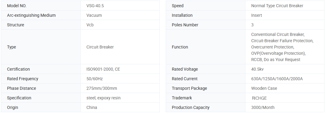 VSG-40.5C టైప్ సైడ్ ఇన్స్టాలేషన్ ఇండోర్ హై వోల్టేజ్ వాక్యూమ్ సర్క్యూట్ బ్రేకర్ వసంతాన్ని నిల్వ శక్తికి ఉపయోగించింది. మాన్యువల్ మరియు ఎలెక్ట్రోమోటివ్ ఆపరేషన్ ద్వారా ఆపరేటింగ్ మెకానిజం రెండు విధాలుగా నిర్వహించబడుతుంది, లక్షణాలు GB1984-2003 హై వోల్టేజ్ AC సర్క్యూట్ బ్రేకర్, JB3855-1996 3.6-4.5KV ఇండోర్ ఎసి హై వోల్టేజ్ ఎసి సర్క్యూట్ బ్రేకర్ మరియు IEC స్టాండర్డ్ 62271-100: 20016227100: 20016227100: 20011627100:
